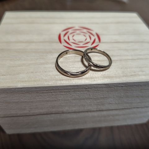 さりげないけれど、捻りのデザインがオシャレで素敵です。 私はひねりの部分をツルッとした仕様・全体をざらついた仕様に、彼はその逆のデザインにしました。 シンプルだけど捻りによって存在感が出るので、歳を重ねても映えるデザインだと思います。