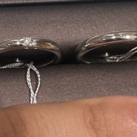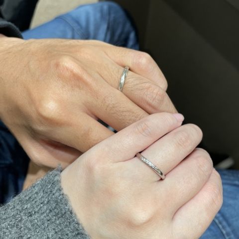 私はサンプルが良かったので、ダイヤが一個ついているものにしました!ダイヤの左右に少し凹みがあるのでダイヤが大きく見えてキラキラして見えます!とても綺麗で可愛いです!彼の方はシンプルにダイヤなしで、少し太めにしました!