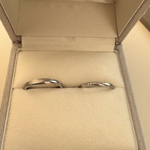 指輪は普段使いがしやすく、どんな服装でも場所でも馴染むので気に入っています! 素材も錆びにくく、強い素材で、指輪の内側には結婚記念日とイニシャルを入れていただき、唯一無二の指輪になりました。 ダイヤもキラッとさりげなく輝くので、シンプル過ぎず、派手過ぎず、気に入っております。