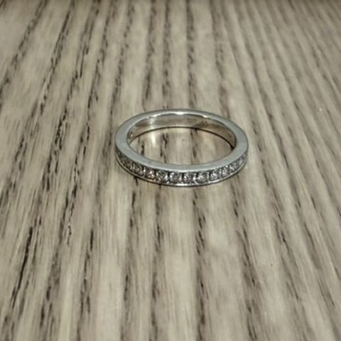 シンプルで王道なハーフエタニティですが、たっぷりのダイヤモンドが敷き詰められていてゴージャスな仕上がりが気に入っています。 太すぎず、細すぎずの程よい太さなのでどんな指の方にも合うと思います。夫も同ブランドの似た形の指輪を選びました。