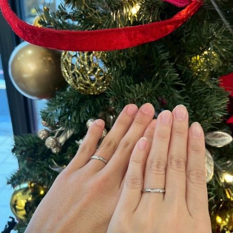 いくつか探した中で、1番指が綺麗に見えて、ふたりのペア感をしっかり感じられる指輪でした。ダイヤの入り方も控えめなのに存在感があり、デザインはシンプルだけど他にはない個性があって、とても気に入っています。