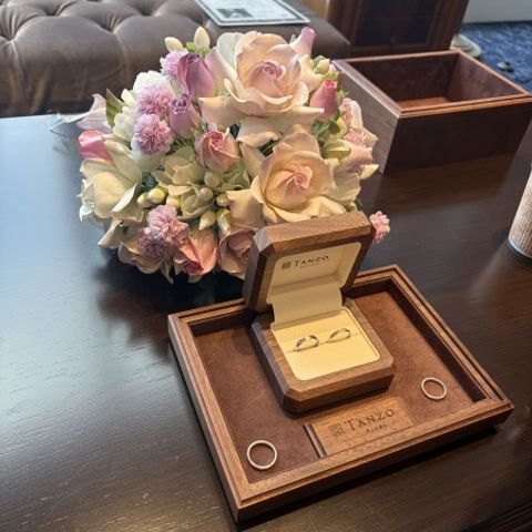 素材やデザインをフルオーダーでリクエストできて、仕上がりも満足しています。特に刻印について、デザイナーさんが写真をもとに細かなデザインを作っていただきました。また、素材はシャンパンゴールドにしましたが、主張が強すぎず気に入っています。