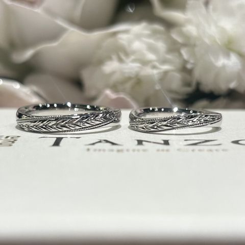 月桂樹の模様を2人とも入れ、男性用はつや消し、女性用はツヤありでダイヤモンドを入れました。お揃いの部分もあり、それぞれの好みも入った指輪が出来上がりました。シンプルだけど、他にはないオリジナルのものができたのでとてもよかったです。