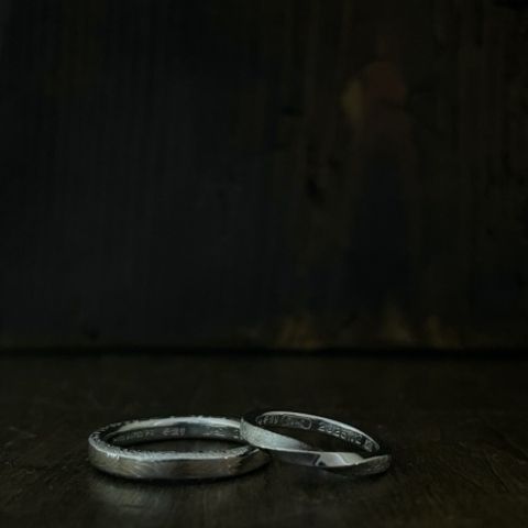 Heard鍛造.コーラルゴールド.幅3.5mm.平打ち.角丸.リング上のみスターダスト加工.リング半周には2人の思い出の山北アルプス山脈を彫刻し、リング内側には雷鳥と富士山を刻印していただきました。 二つのリングを横に並べると山脈になり、上下に並べると内側の富士山が逆さ富士になるようにデザインしていただきました。 リング上部のみに入れたスターダスト加工は山と満点の星空をイメージしています。角丸加工をすることであまり太さを感じることなく、引っかかりもなくなるので手に馴染みます。