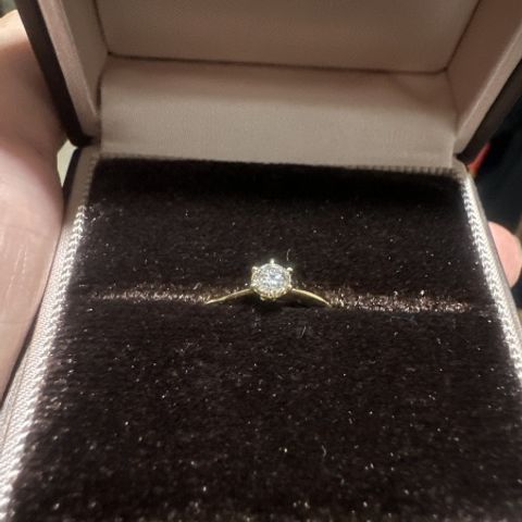 自分の指に合うものが欲しいと何店舗かお伺いした中で、特に目を引いたものでした。シンプルですが、手元がパッと華やかになるデザインに惹かれ、即決しました。 光に当たるとダイヤが淡く輝き、目を引くような美しさです。