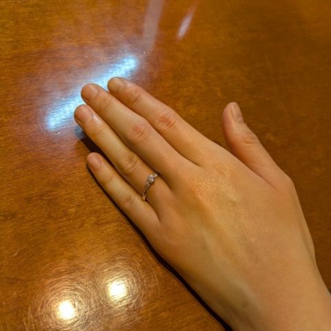 いくつか探した中で、1番指が綺麗に見えて、ふたりのペア感をしっかり感じられる指輪でした。ダイヤの入り方も控えめなのに存在感があり、デザインはシンプルだけど他にはない個性があって、とても気に入っています。