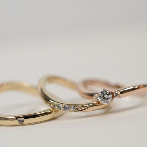 指輪のリング自体はシンプルで着け心地が良いです。そこに、テーマに合わせた風になびくようなラインで石が埋め込まれている所がこの指輪の素敵なポイントだと思います。色味についても、悩んだ結果ピンクゴールドを選択しましたがピンクが強く主張される訳でもなく程よい色味なのもお気に入りです。