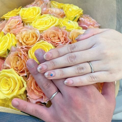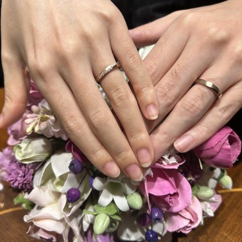 旦那が仕事上、華美なものがつけられないので、静かめに、かつ少し遊びがあるようなデザインがよく、この結婚指輪にしました。 私のリングも、ネイルやほかのリングをした時でも浮かないようなデザインで惹かれて選びました。