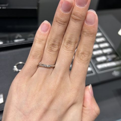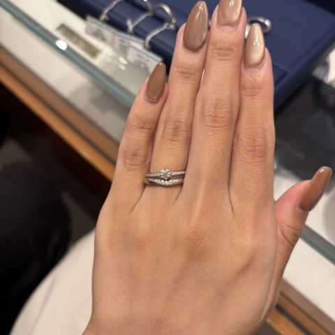 一目見た時にダイヤモンドの輝きに目が行き、試着させていただきました。つけてみると結婚指輪のみでも存在感がかなりあり、婚約指輪と重ね付けをするとさらに華やかでキラキラに惹かれる私にはかなり期待以上のデザインでした!