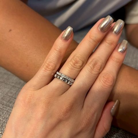 シンプルで見た目もオシャレで重ね付けもしやすい。 婚約指輪は、普段つけないイメージも多いがこれならずっと付けれる。デザインがどの指輪ともあうので、重ね付けした際により一層指輪が強調されてとても良いと思う。
